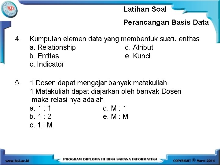Basis data atau biasa disebut database adalah suatu kumpulan data yang tersimpan di suatu server. 6 july 2014, 05:07 by diklat. Pelajari 40 contoh soal latihan basis data pilihan ganda beserta. Soal kuis sbd tentang conflict serializability dan serializability . Jelaskan perbedaan antara data pengolahaan dan informasi ?